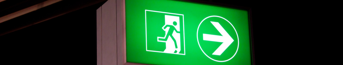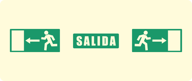 Señales de emergencia para la evacuación de edificios indicando los recorridos de evacuación y las salidas de emergencia, según norma UNE.